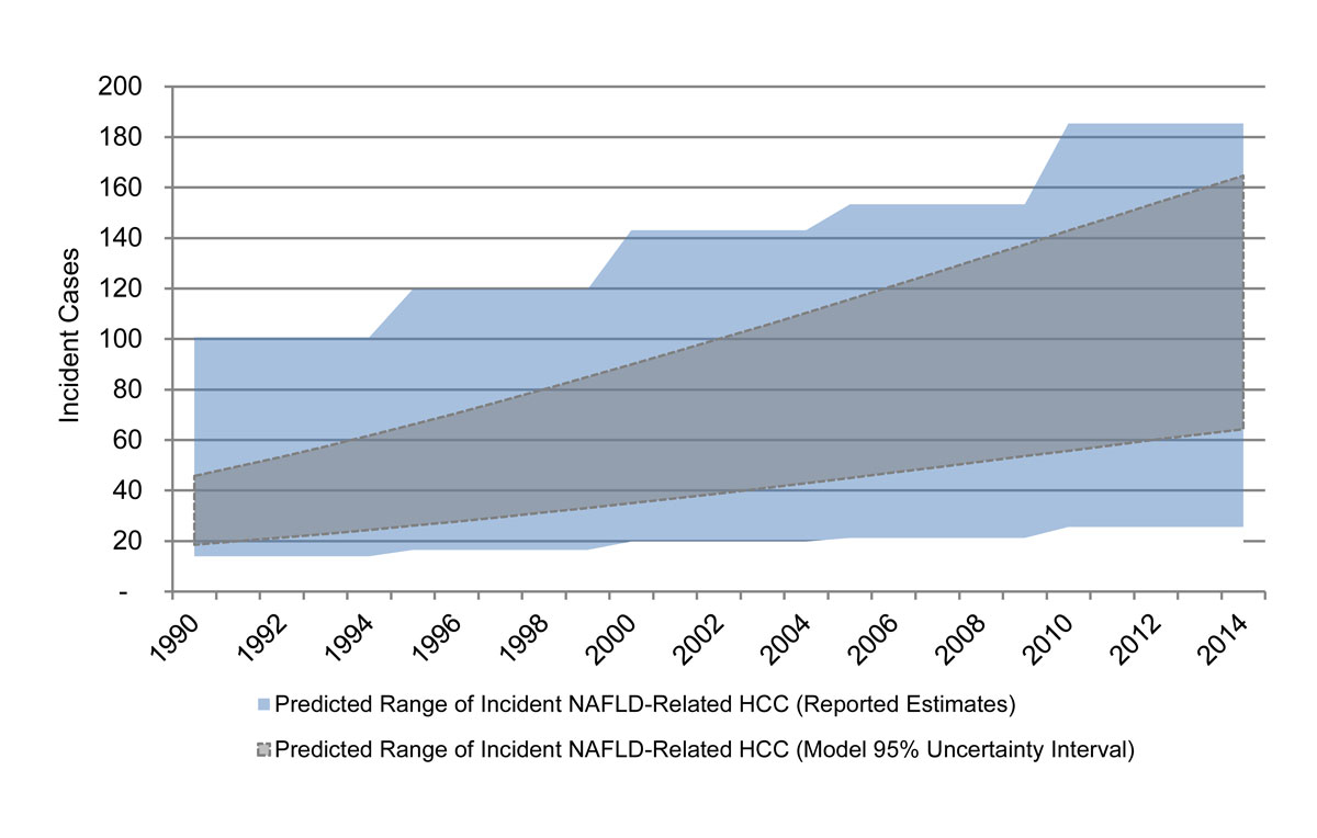 There were 2192 total incident liver cancer cases during 1990–1994, increasing to 4035 by 2010–2014. After an estimated rate of incident liver cancer underreporting of 10% was applied, annual incident liver cancers were estimated to be 482 cases annually during 1990–1994, increasing to 888 cancers annually during 2010–2014. There are a range of estimates for cancer morphology, but for the base estimate, 72% of liver cancers were assumed to be HCC, meaning that annual HCC cases increased from 347 during 1990–1994 to 639 annual cases by 2010–2014. Finally, a wide range was considered for the proportion of HCC cases that could be NAFLD related. These cases were estimated at 59 (14–101) cases during 1990–1994, increasing to 109 (26–185) cases during 2010–2014.