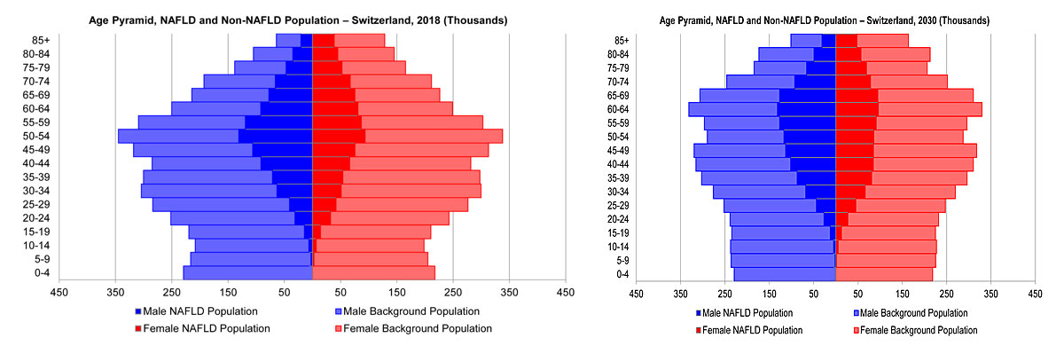 Figure 2 Model age distribution of nonalcoholic fatty liver disease (NAFLD) and background population by sex and age group (thousands) – Switzerland 2018 and 2030.