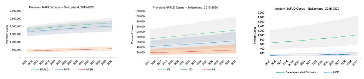 Figure 1 Model estimated cases by disease stage with 95% uncertainty interval – Switzerland 2015–2030. NAFLD = nonalcoholic fatty liver disease.