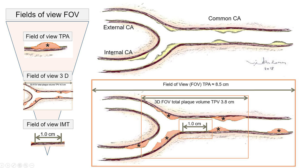Figure 4 Schematic view of the carotid artery, displaying fields of view and types of measurements. Principle measurements of atherosclerosis in the carotid artery are either intima media thickness (IMT; far wall of the distal part of the common carotid artery perpendicular to the ultrasound beam in diastole according to the Mannheim Consensus [15, 17]); 3D plaque volume encompassing a field of view (FOV) of 3.8 cm using the Philips iU 22 ultrasound system [18], providing the a total plaque volume (TPV), which however may exclude plaque e.g. proximal or distal to the FOV of 3.8 cm; total plaque area (TPA), which measures all longitudinal plaque (in mm2) visible from the subclavian artery to the most distal parts of the common and internal carotid arteries, usually over a FOV of 8.5 cm or more. The most information on the total plaque burden is therefore provided by the TPA, followed by TPV and IMT. However, TPV can include plaques that are located laterally in the vessel and not visible with the TPA method. Therefore, TPA should include also lateral plaque from transversal images. The correlation coefficient between TPA and TPV is r2 = 0.921 (p <0.0001) [19].