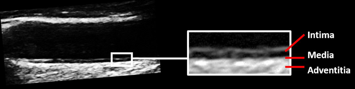 Figure 2 Anatomy of the carotid artery wall. The image represents the far wall of the common carotid artery showing the intima and media, defined by the distance between the endothelium and the external elastic membrane. For clinical purposes, the distance between the endothelium and the tunica adventitia is measured to obtain the intima-media thickness (IMT).
