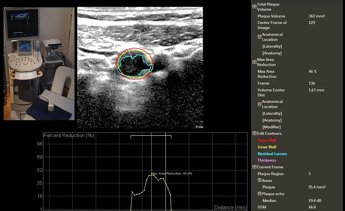 Whereas initial outcome studies with atherosclerosis imaging in the past compared one method with traditional risk factors, two large-scale studies, BioImage [34] and MESA [65], have directly compared coronary calcifications with carotid ultrasound imaging (table 4). The BioImage study, involving 5808 healthy subjects and published in 2015 by Baber et al., directly compared the total volume of carotid plaques acquired with a Philips iU 22 ultrasound system (fig. 5). In a direct comparison of carotid TPV with the presence and amount (score) of coronary calcium (a measure of the total calcified plaque burden in the whole coronary tree), the predictive power for cardiovascular events was noninferior in a low- to intermediate-risk population (table 2b). The MESA study included 6779 healthy subjects and was published by Gepner et al. in 2015 [65]. It compared the presence of coronary calcium with the presence of carotid plaques and carotid IMT above the 75th percentile to predict cardiovascular events and found that only coronary calcium and carotid plaque presence were predictive, whereas carotid IMT was not. For the prediction of stroke / transient ischaemic attack, only the presence of carotid plaques was predictive after 9.5 years of observation time.