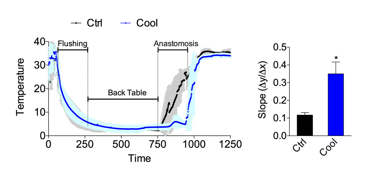 Figure 2 Temperature curve from procurement to reperfusion. Curve (left) and slope during anastomosis (right) in the control or cooling group (n = 6–7). Errors bars indicate the standard error of the mean. * p <0.05; Ctrl = control