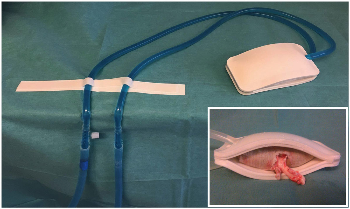 Figure 1 The cooling device. The cooling device is a watertight double sheath of silicone surrounding the kidney and continuously perfused via a tubing system with ethanol and methylene blue at 4°C. Inset: kidney with the perfused cooling device.
