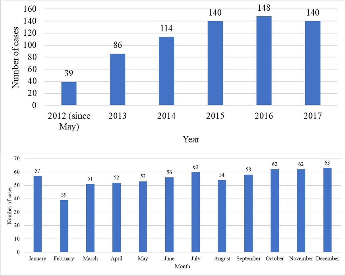 Figure 1 Annual (a) and monthly (b) distributions of the cases for which contact with the Poisons Information Centre was undertaken at the emergency department (N = 667).