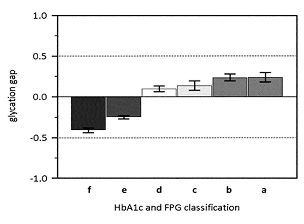 The six alphabetic characters represent, from left to right, increasing impairment of fasting glucose. (e) and (f) are the healthy groups according to Heianza et al. [34]. Please note that the glycation gap changes from below zero to above zero as glycaemic control deteriorates. Impairment of glycaemic regulation increases from left to right.
