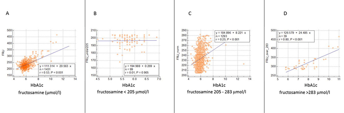 This 4-panel figure compares glycated haemoglobin A1c and fructosamine levels in three different fructosamine concentration ranges (data from 1431 participants). A all participants. B subjects with fructosamine concentrations <205 μmol/l. The glycated haemoglobin A1c values range from 4.5% to 7.0%. C Participants exhibiting fructosamine values within the reference interval. Glycated haemoglobin A1c values are within a narrow window. D individuals with high fructosamine levels have glycated haemoglobin A1c values between 5.8% and 11%.