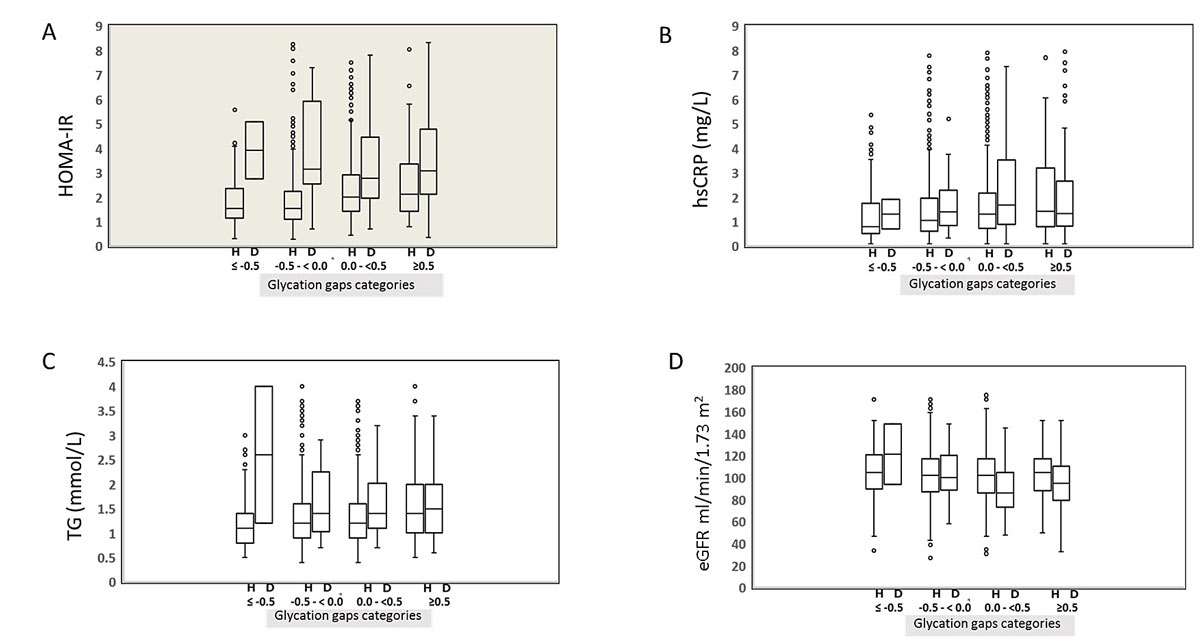Statistical box and whiskers diagram around median values. (A) Differences between healthy (H) and diabetic (D) participants were calculated with chi-square and Mann-Whitney tests, as appropriate; (B) hsCRP, high-sensitivity C-reactive protein; (C) TG, triglyceride; (D) GFR, glomerular filtration rate. As can be seen from the figure, in healthy participants, homeostasis model assessment for estimation of insulin resistance (HOMA-IR), high-sensitivity C-reactive protein (hsCRP) and triglyceride (TG) values increased with glycation gap category (p<0.001). In diabetic participants, differences between healthy and diabetic participants were calculated with chi-square and Mann-Whitney tests, as appropriate.