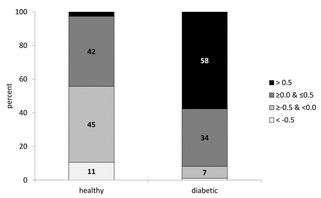 Figure 3 Percentage of participants in each glycation gap category. Diabetic participants clearly exhibited a trend towards higher glycation gap categories. The grey shading darkens as the glycation gap changes from below zero to above zero, reflecting the impairment of glycaemic control.