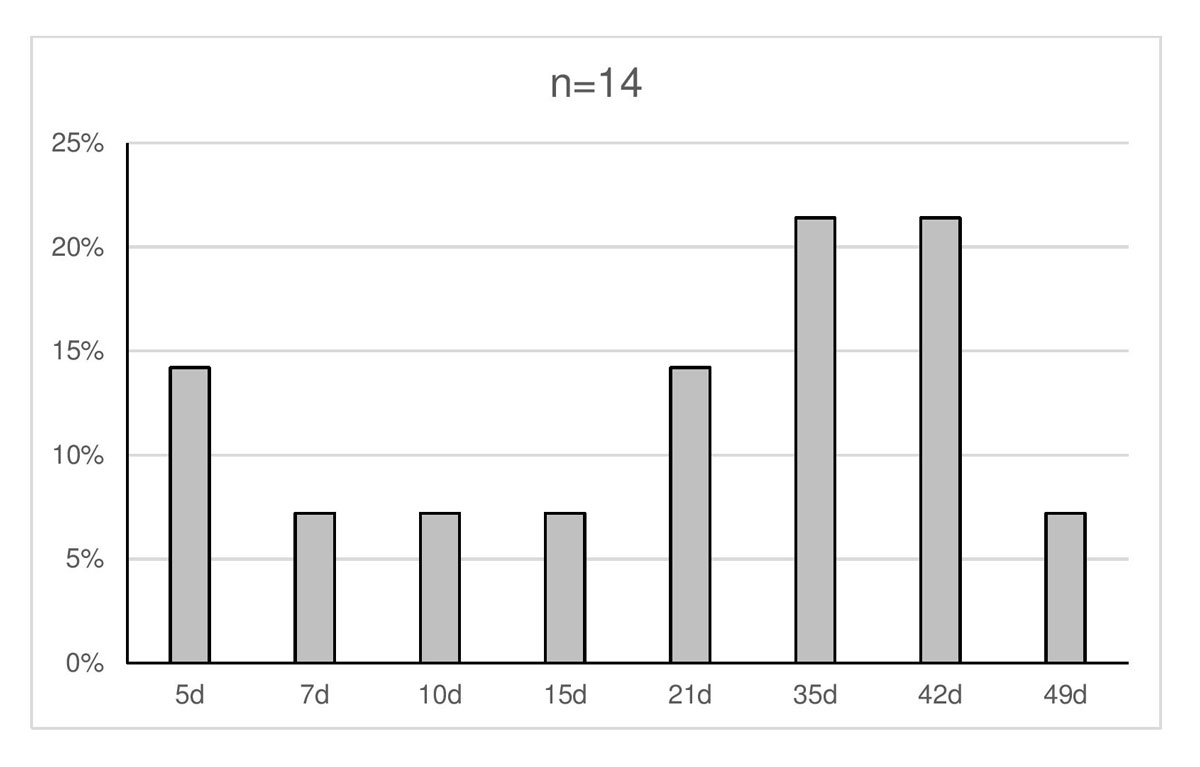 Figure 2 Maximum shelf life of red blood cells: X axis is days (d), Y axis is the percentage of participants providing this response.