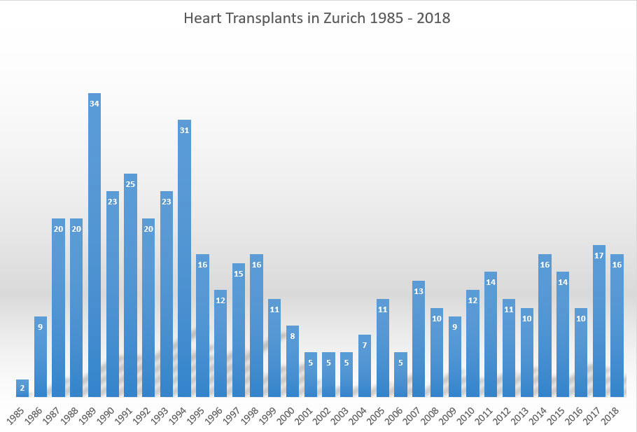 Figure 2 Number of heart transplants in Zurich from restart of the programme in 1985 until 2018.