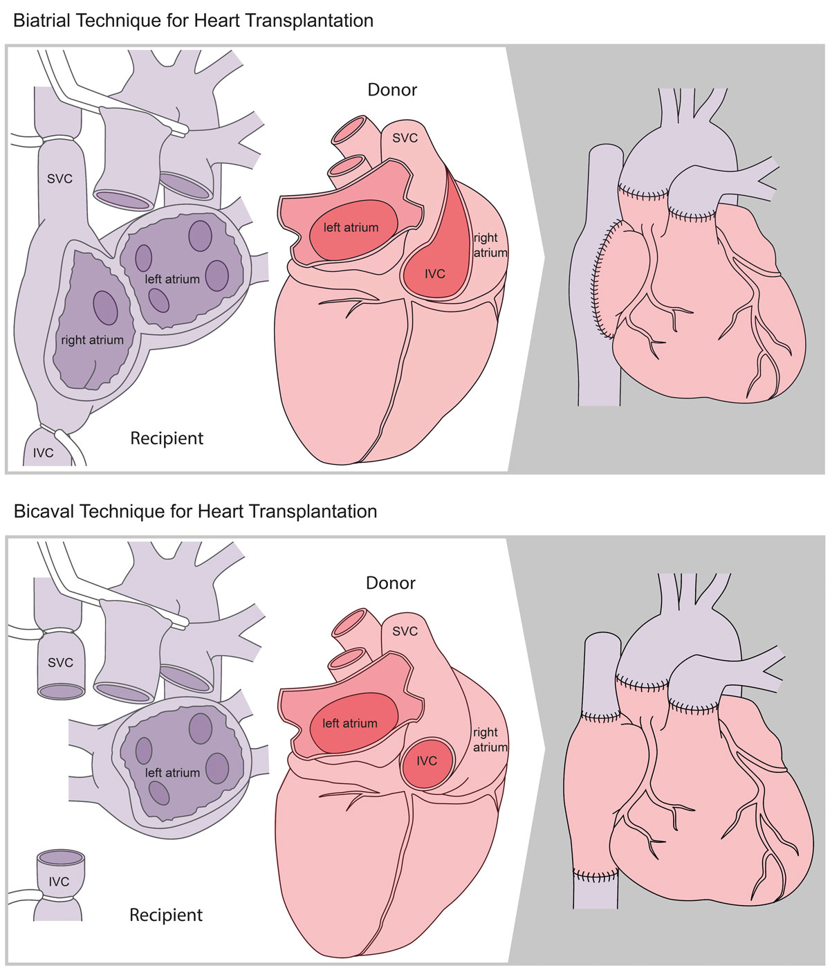 Figure 3 Illustration of the two different surgical techniques for heart transplantation. Upper panel: the classic biatrial technique. Lower panel: the modified bicaval technique.