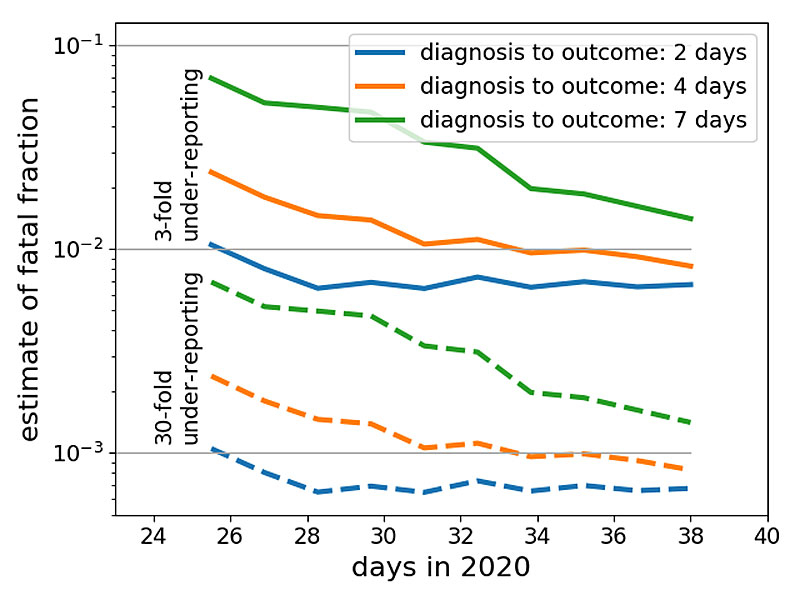 At present, it is tempting to estimate the case fatality rate by dividing the number of known deaths by the number of confirmed cases. The resulting number, however, does not represent the true case fatality rate and might be off by orders of magnitude. Diagnosis of viral infection will precede recovery or death by days to weeks and the number of deaths should therefore be compared to the past case counts – accounting for this delay increasing the estimate of the case fatality rate. On the other hand, cases in official statistics are likely a severe underestimate of the total – accounting for this underestimate will decrease the case fatality rate. The time between diagnosis and death/recovery and the degree of underreporting will vary over time as well as between cities and countries. A precise estimate of the case fatality rate is therefore impossible at present. Figure 1 illustrates how these uncertainties manifest themselves using currently available data.