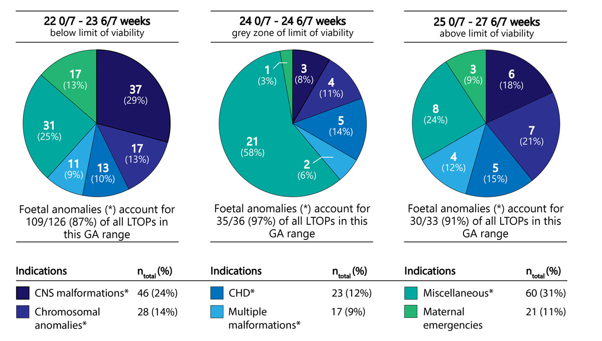 Figure 3 Comparison of the indications for LTOP at <24 completed weeks (below current limit of viability in Switzerland), 24 weeks (grey zone of current limit of viability in Switzerland) and ≥24 completed weeks (above current limit of viability in Switzerland) (CNS = central nervous system; CHD = congenital heart disease; LTOP = late termination of pregnancy; GA = gestational age).