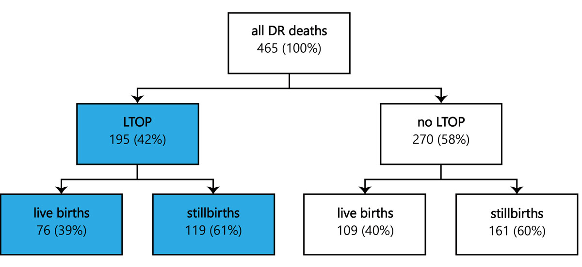 Figure 1 Overview of all delivery room (DR) deaths recorded by the SNSF project 67 over a 3-year period from 1 July 2012 to 30 June 2015; in 195 cases labour was induced for late termination of pregnancy (LTOP).