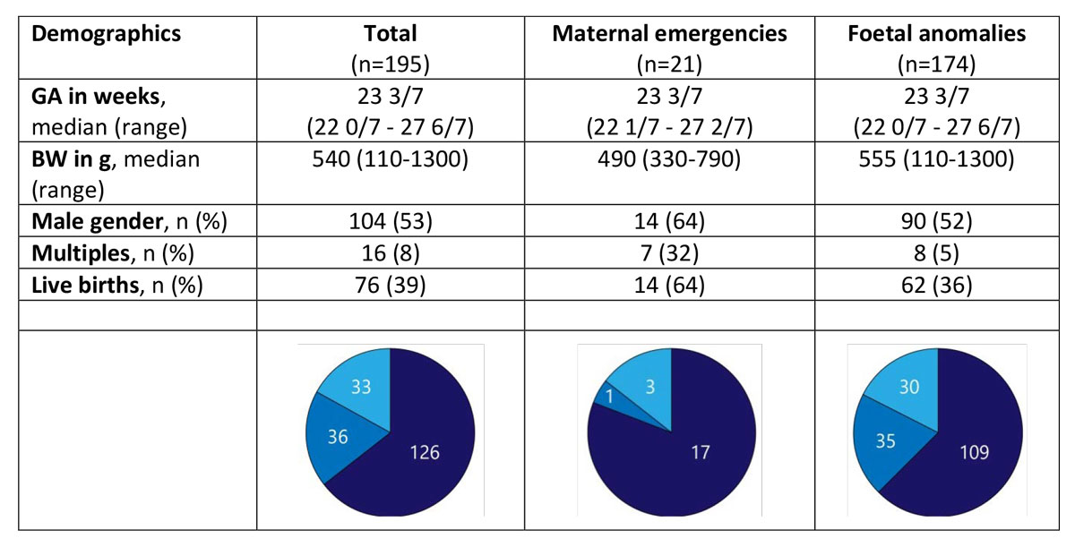 Figure 4 Demographics and gestational age categories (22 0/7 to 23 6/7: below current limit of viability in Switzerland, 24 0/7 to 24 6/7: grey zone of current limit of viability in Switzerland; 25 0/7 to 27 6/7: above current limit of viability in Switzerland) of late terminations of pregnancy for maternal emergencies and fetal anomalies (GA = gestational age; BW = birth weight).