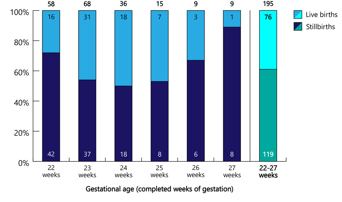 Demographic data were comparable between live and stillborn infants with a median gestational age and birthweight of 23 3/7 weeks and 550 g versus 24 0/7 weeks and 530 g, respectively (table 1). Fetal death caused by injection of a cardioplegic drug was documented in three cases (for details see table S1 in appendix 1).