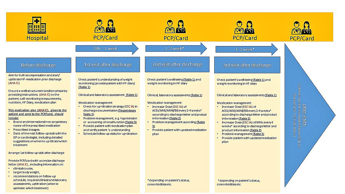 There is a growing body of evidence suggesting that HF patients are particularly vulnerable to disruptions in care during the transition phase [7, 9, 10]. For example, it has been shown that readmission rates can be reduced if the first outpatient follow-up visit is scheduled prior to hospital discharge [1]. In line with this study, the 2016 ESC guidelines for acute and chronic HF propose a care plan ensuring a well-structured transition phase to improve treatment outcomes [1].