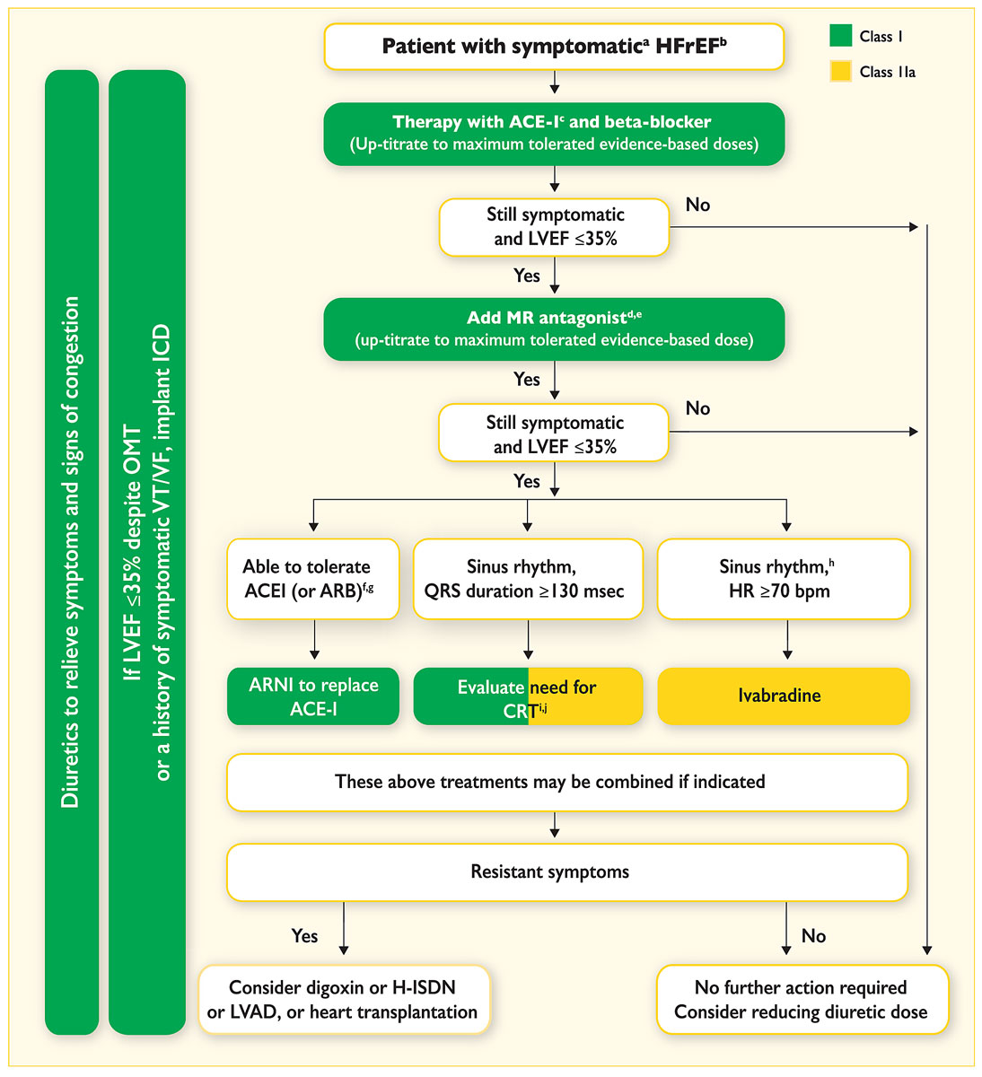 a Symptomatic = NYHA Class II-IV. b HFrEF = LVEF <40%. c If ACEI not tolerated / contraindicated, use ARB. d If MR antagonist not tolerated / contraindicated, use ARB. e With a hospital admission for HF within the last 6 months or with elevated natriuretic peptides (BNP >250 pg/ml or NTproBNP >500 pg/ml in men and 750 pg/ml in women). f With an elevated plasma natriuretic peptide level (BNP ≥150 pg/ml or plasma NT-proBNP ≥600 pg/ml, or if HF hospitalisation within recent 12 months plasma BNP ≥100 pg/ml or plasma NT-proBNP ≥400 pg/ml). g In doses equivalent to enalapril 10 mg b.i.d. h With a hospital admission for HF within the previous year. I CRT is recommended if QRS ≥130 msec and LBBB (in sinus rhythm). j CRT should/may be considered if QRS ≥130 msec with non-LBBB (in a sinus rhythm) or for patients in AF provided a strategy to ensure bi-ventricular capture in place (individualised decision). Adapted from Ponikowski P, Voors AA, Anker SD, Bueno H, Cleland JGF, Coats AJS, et al.; ESC Scientific Document Group. 2016 ESC Guidelines for the diagnosis and treatment of acute and chronic heart failure: The Task Force for the diagnosis and treatment of acute and chronic heart failure of the European Society of Cardiology (ESC). Eur Heart J. 2016;37(27):2129–200 [1].