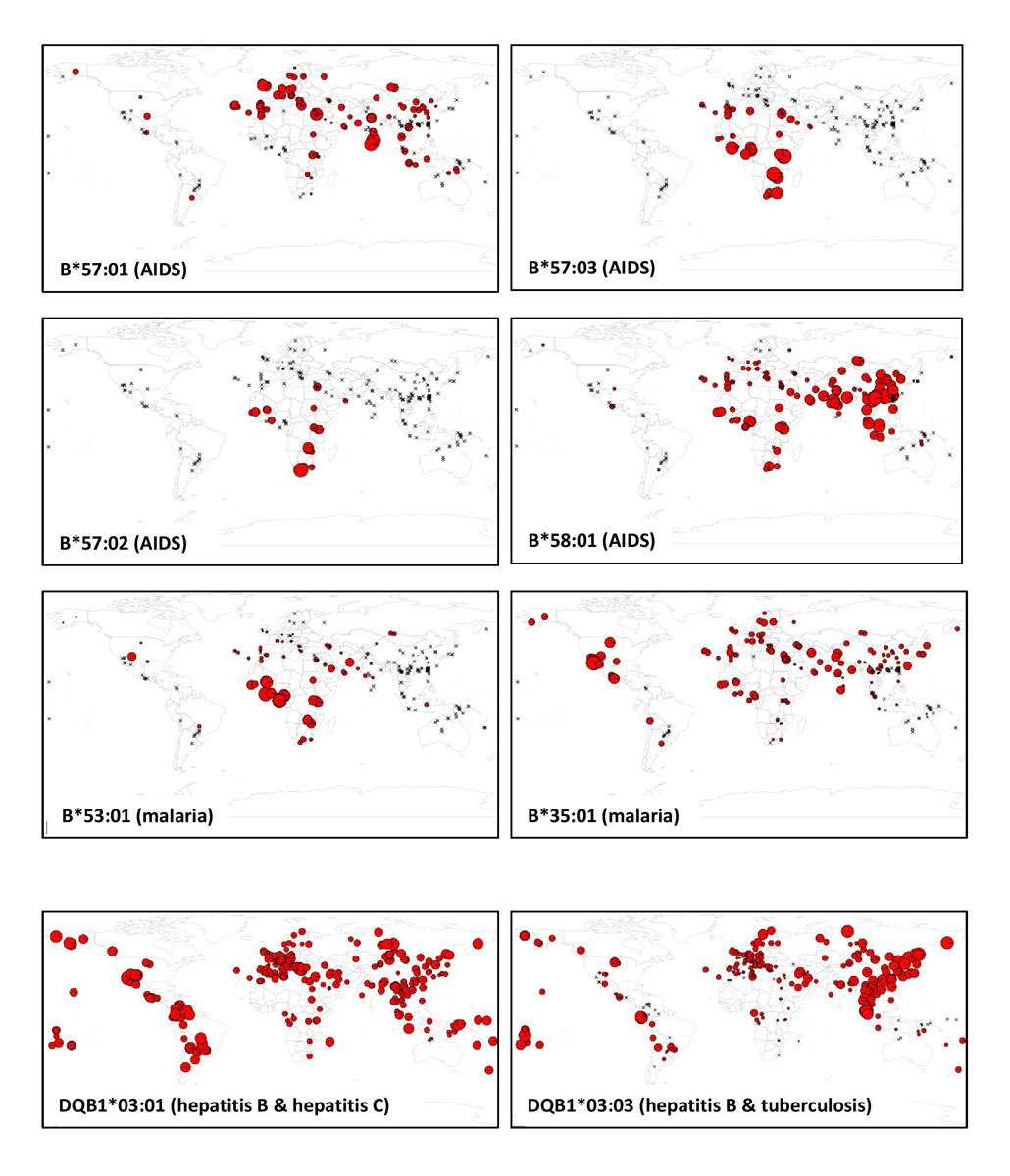 Figure 2 Worldwide population frequency maps of some of the HLA-B alleles suggested to confer protection against AIDS (B*57:01, B*57:02, B*57:03, B*58:01) and malaria (B*53:01, B*35:01) as well as of two HLA-DQB1*03 alleles suggested to be associated to hepatitis B susceptibility (DQB1*03:01 and DQB1*03:03), to hepatitis C protection (DQB1*03:01) and to tuberculosis susceptibility (DQB1*03:03) (see text for references).
