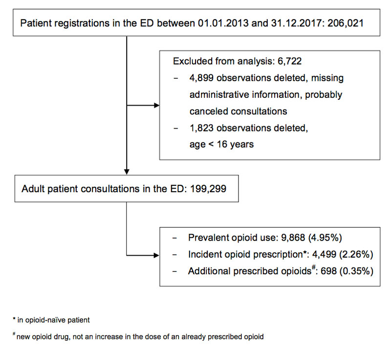 In an analysis of 5308 young adult men from the Swiss cohort study on substance use risk factors, non-medical use of prescription opioids was strongly associated with traumatic events such as traffic accidents, earthquakes, severe illness or injury [11]. Most patients facing such events will be treated in an ED. Conversion to persistent opioid use has been shown to increase in patients receiving an opioid prescription in the ED [12].