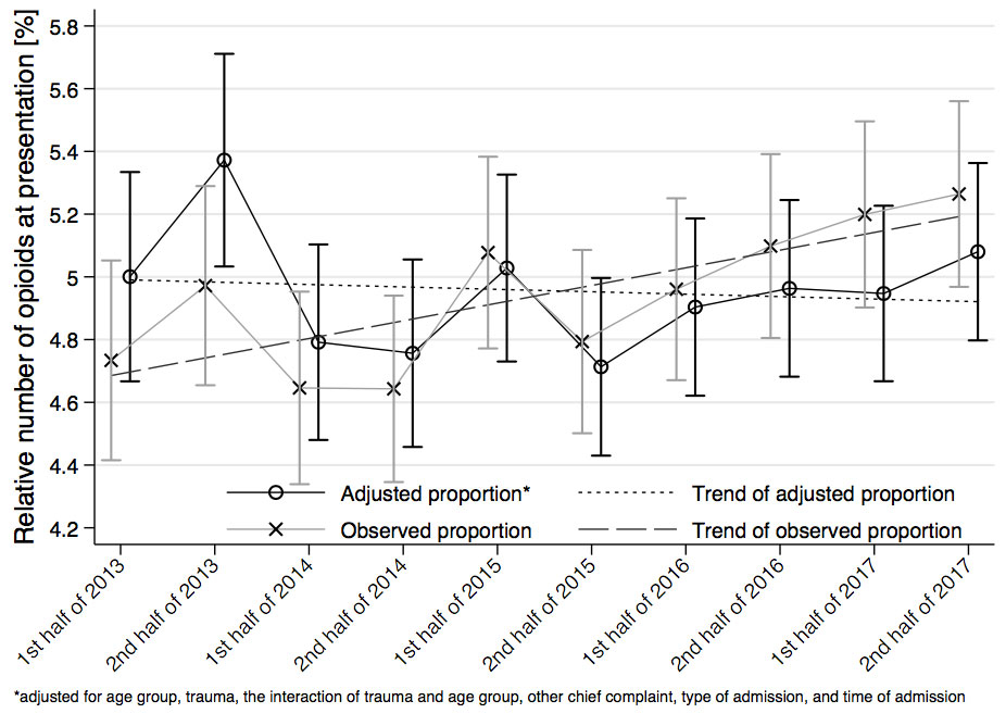 The proportion of patients per half year with documented opioid use on presentation over the study period is shown in figure 3 (table S1B and fig. S2 in appendix 1). The observed proportion ranged from 4.64% (95% CI 4.35–4.94%) in the second half of 2014 to 5.26% (95% CI 4.97–5.56%) in the second half of 2017 and showed a significant positive linear trend over time (p <0.001), corresponding to an increase in prevalent opioid consultations of about 0.06% per half year; see figure 3 (slope 0.058%, standard error 0.017%). In multivariable analysis, the increasing linear trend over the study period could not be confirmed (slope −0.001%, standard error 0.017, p = 0.736) as there was no significant association of the adjusted proportions and half year (p = 0.163) after adjustment for age group, trauma, the interaction of trauma and age group, other chief complaints, type of admission, and time of admission (fig. 3 and table S1B).