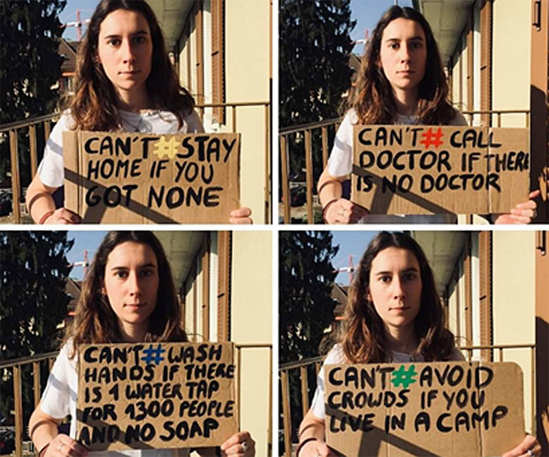 Figure 3 Swiss activist raising awareness on the difficulties to implement COVID-19 prevention measures in refugee camps (pictures provided by Céline de Richoufftz, reproduced with permission).