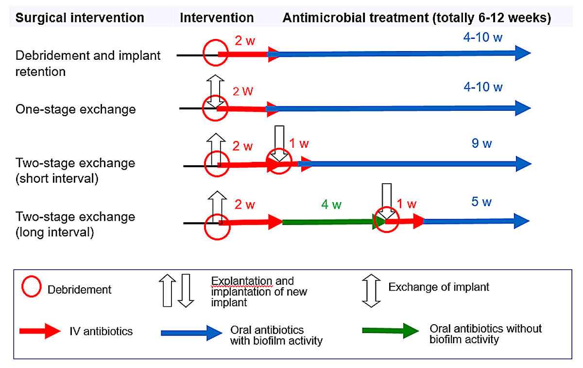 In selected patients, implant retention is possible. Prerequisites for implant retention are acute infections with immature biofilms (≤6 weeks), availability of biofilm-active treatments and adequate soft tissue coverage of the implant [17]. Prolonged biofilm-active treatment for 12 weeks eradicates the biofilm thereafter. In chronic infections (>6 weeks) implant removal or exchange in a one- or two-stage procedure with only a short implant-free interval of 14 days is recommended to remove the mature biofilm. This surgical strategy is followed by usually 12 weeks of biofilm-active treatment. If intraoperative culture results are negative in the case of a two-stage implant exchange, a shorter treatment duration of 4–6 weeks is possible. Despite negative intraoperative culture results during reimplantation, which usually is performed under antimicrobial treatment, treatment continuation is suggested, as culture results under antimicrobial treatment might be false negative. And an infection relapse can be associated with devastating complications for the patient, if, for example, another surgery is needed.