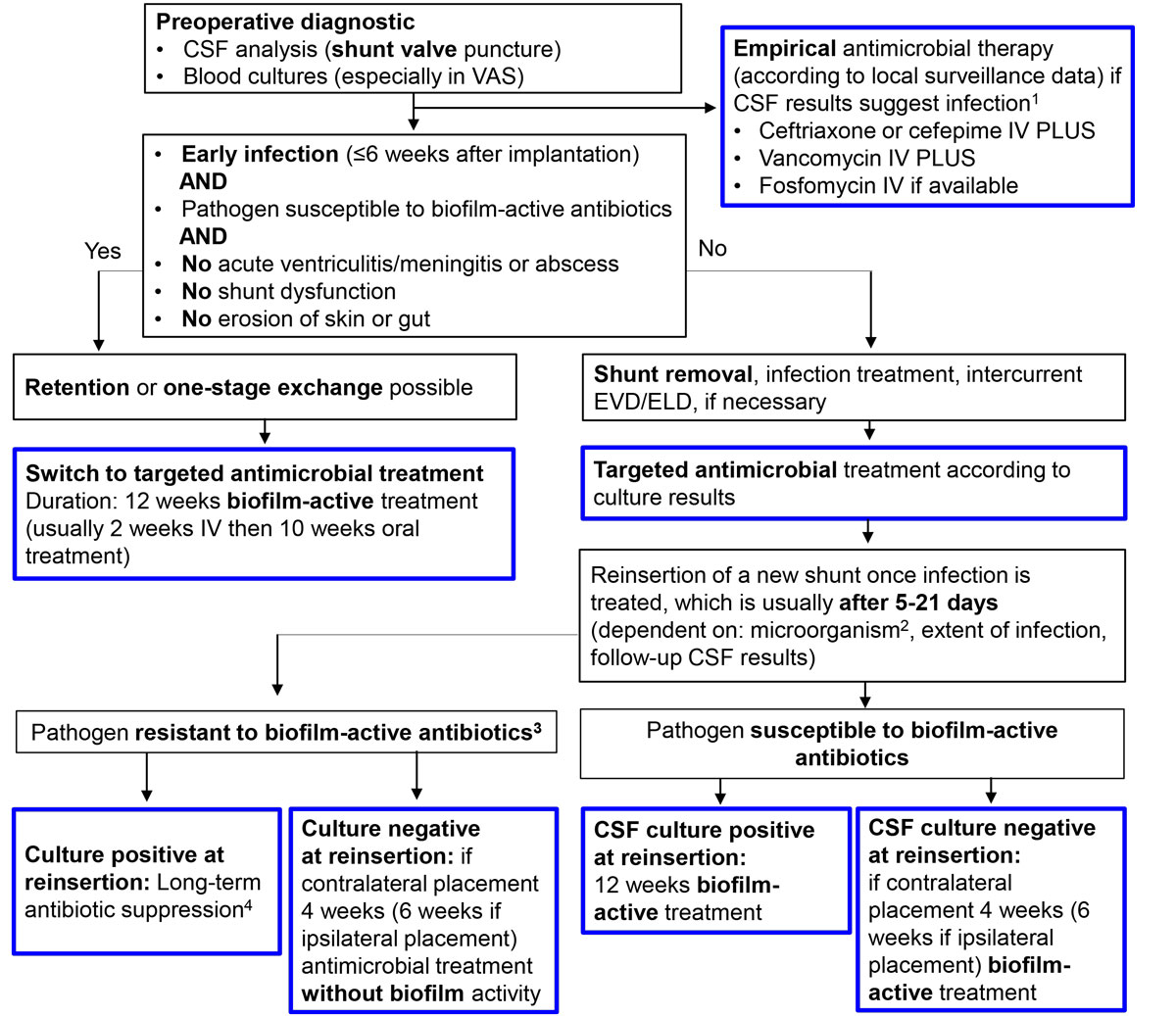 EVD and ELD are temporary implants mostly used to treat acute hydrocephalus after intracranial bleeding or severe craniocerebral injury. Because of the temporary placement, management of EVD- and ELD-associated infections differs from that of CSF shunt-associated infections, as no biofilm-active treatment is necessary. However, EVD- and ELD-associated infections can be challenging to manage, especially if the patient is dependent on an external CSF drainage and needs a permanent CSF shunt, which often must be placed timely and at the time when the infected EVD or ELD is removed. Up to 44% of patients with an EVD or ELD need a CSF shunt [73]. EVD- and ELD-associated infections occur in 2–22%, with an average infection rate of 8% [2]. The most common pathogens are staphylococci and other members of the skin flora such as Cutibacterium spp., but polymicrobial infections also occur [73, 74]. Risk factors for infection are cranial fracture with CSF leakage, duration of CSF catheterisation (≥8 days), repetitive CSF sampling from EVD or EVD irrigation [75–78]. Whether the EVD was placed in the operating room or at the bedside in an intensive care unit or emergency department, and whether a silver-coated EVD or ELD was used did not have an impact on the infection rate; a tunnelled EVD, however, was associated with a lower rate of infection [38, 74, 78–80]. We absolutely discourage the use of rifampin-coated EVDs and ELDs, which expose pathogens in the CSF to rifampin monotherapy and select for rifampin-resistant bacteria (mainly coagulase-negative staphylococci) [81]. This will prevent cure of an ensuing CSF shunt-associated infection, as no biofilm-active therapy is available.