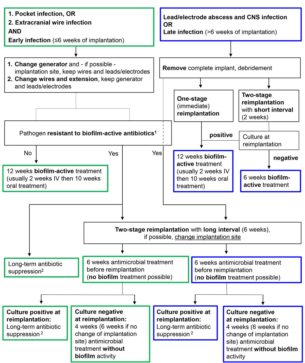 In cases of infection, device removal or a lead/electrode-sparing procedure with partial explantation of the device and reimplantation weeks after the infection is cured is recommended by several authors. However, this procedure is associated with significant morbidity and inconvenience for the patient, as multiple (brain) surgeries are necessary, and symptoms recur during the implant-free interval. In addition, high healthcare costs due to the lost stimulator system can be expected [52, 54]. Therefore, our suggestion includes again extrapolating the treatment algorithm from orthopaedic surgery, which allows the implant to be retained or only partially exchanged in selected patients. Prerequisites for this strategy are acute infections, availability of biofilm-active therapy and adequate soft tissue coverage of the implant. Thereafter, a 12-week biofilm-active therapy is followed (tables 2, 3 and 4 ) [17]. Depending on the infected part of the neurostimulator, we suggest the following procedures (fig. 4). In acute pocket infections, generators can be debrided and retained if biofilm-active therapy is available. Preferably, the implantation site of the generator should be changed because of the usually poor soft tissue condition in infection. Leads, electrodes and wires can be retained. If there is an extracranial or spinal wire infection, wires should be changed as far as possible, but generator, leads and electrodes can be retained. The antimicrobial treatment and its duration depend on the infected part of the stimulator and the surgical strategy chosen. In the case of a difficult-to-treat infection, where no biofilm-active therapy is available, long-term antimicrobial suppression therapy is an alternative, especially if device removal is deemed impossible. Device removal is mandatory in the event of life-threatening infections including lead- and electrode-associated brain or epidural abscesses, or meningitis.