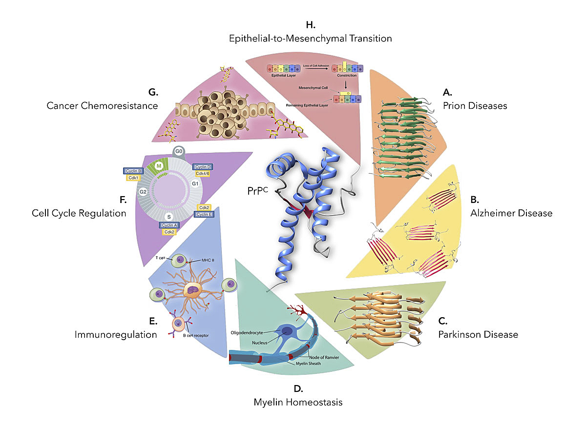 Figure 1 The physiological and pathological processes in which PrPC (PDB 2LFT) may play a role. In addition to serving as a substrate for PrPSc replication (model depicted in A from [149]), the protein has also been reported to act as a receptor for Aβ oligomers (B, PDB 6RHY) and misfolded α-synuclein (C, PDB 2N0A). Surprisingly, PrPC has also been involved in myelin homeostasis (D), immunoregulatory processes (E) and cancer, mainly at the levels of cell cycle regulation (F), drug resistance (G) and epithelial-to-mesenchymal transition (H), among others.