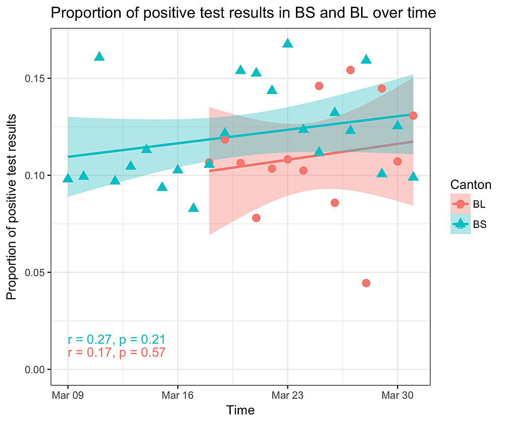 Finally, we looked at the ratio of the number of positive tests to the total number of tests per day for the University Hospital in Basel-Stadt (in particular, all the samples from the main cantonal testing centre which has been open in its current form since 9 March are tested at this hospital), and for the two testing centres in Basel-Landschaft (open since 18 March), see figure 4. The correlation between time and ratio was not significant for either canton (p-value for Basel-Stadt 0.21; for Basel-Landschaft 0.57). We want to highlight that these testing centres do not only test people from the respective canton. Further, some people from the respective canton may be tested elsewhere. Nevertheless, being the major testing centres of the cantons, the relative numbers should indicate the trend of testing intensity for the respective canton.