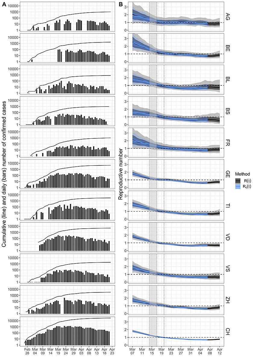 Figure 2 Reproductive number of COVID-19 in Switzerland and 10 cantons. A: The line shows the cumulative number of confirmed COVID-19 cases in Switzerland and 10 cantons. The bars show the number of newly confirmed cases for a particular day. Note that the y-axis is on a log scale. B: The reproductive number through time estimated based on the confirmed case data. In black, we show the median of means for R(t) and the lighter areas correspond to the two uncertainty intervals. In blue, we show the estimated values for Rc(t) as a sensitivity analysis. The vertical dotted lines are public health measures. In particular, the right of the gray interval is the time of the “Ausserordentliche Lage” (a lockdown) with non-essential shops and schools being closed. The dashed horizontal line highlights the threshold value R(t)=1.