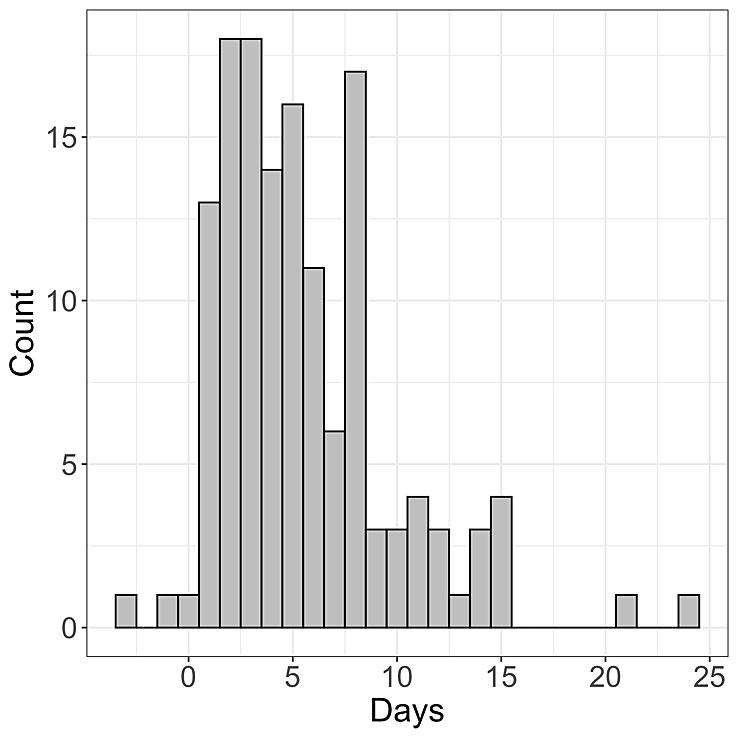 Figure 1 Time between COVID-19 symptom onset and case confirmation. Histogram of the time between symptom onset and case confirmation for 139 patients from Basel-Landschaft.