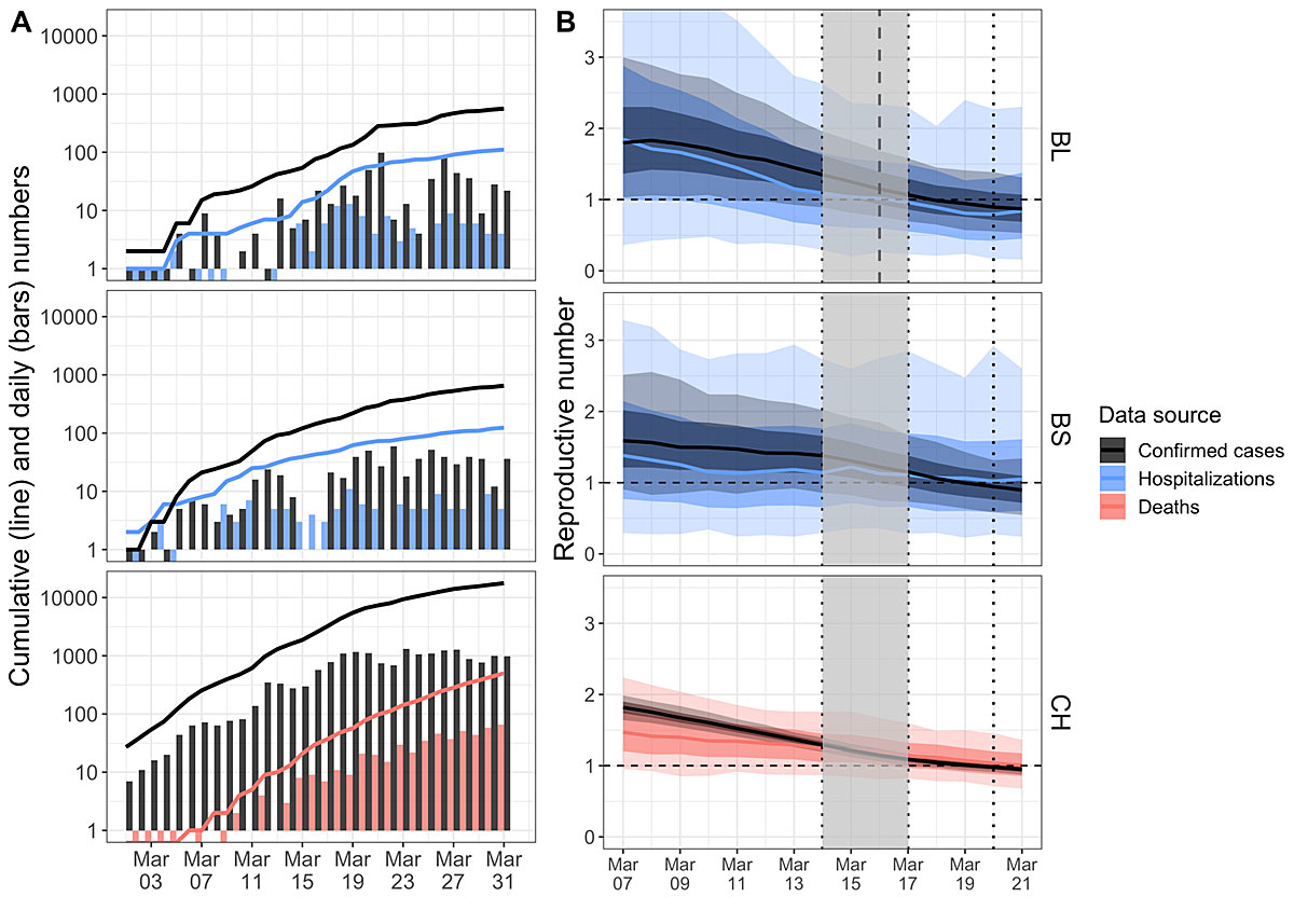 For the cantons of Basel-Stadt and Basel-Landschaft, we compared the number of confirmed cases through time and the number of newly hospitalised COVID-19 patients. Again, until 31 March there were no changes in the guidelines for when to hospitalise a patient. Thus we have no reason to suspect that the chance of a COVID-19 case being hospitalised changed through time. In Figure 3A (top and middle), we show the number of confirmed cases and the number of hospitalisations. Figure 3B (top and middle) shows the estimates of R(t).