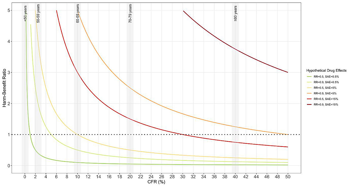 In figure 1, we have modelled a range of harm-benefit curves for off-label drugs with diverse efficacy and safety profiles in the treatment of infectious diseases caused by an unspecified pathogen. This could likely represent severe acute respiratory syndrome coronavirus 2, with a sharp increase in case fatality ratios for higher age groups (as depicted with age bands). This hypothetical example illustrates that some scenarios could result in net beneficial effects (harm-benefit ratio <1) of off-label treatments in patients with various case fatality ratios. In the end, harm-benefit ratios will be influenced by the case fatality ratio as well as the clinical efficacy and safety profile of an off-label drug regimen. If the relative risk reduction of all-cause mortality is small, then only those with higher case fatality may benefit sufficiently to outweigh the risk of serious adverse events. For COVID-19, a high case fatality has been observed in some cohorts despite early treatment with off-label drugs. Importantly, the first randomised controlled trials in COVID-19 patients showed no beneficial effects of certain off-label treatments compared with placebo. This may indicate that the expected clinical efficacy of these specific off-label drugs is limited (or absent) – shifting the harm-benefit curve to the right, towards higher case fatality ratios. These high-risk populations may, however, be disproportionally affected by drug-drug interactions, serious adverse events and comorbidities, which may complicate and argue against off-label treatment initiation.