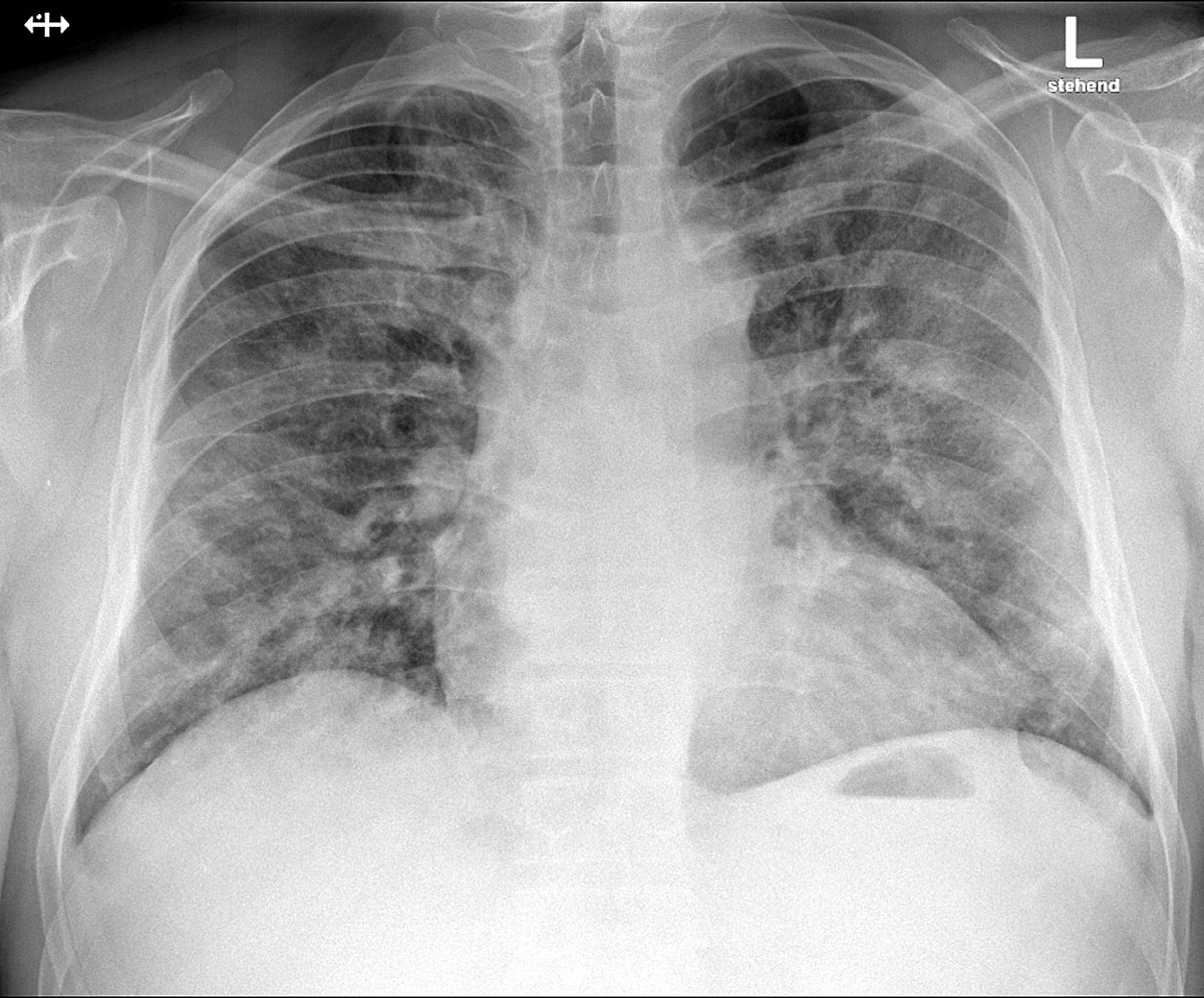 Figure 1 Posteroanterior chest X-ray at admission, demonstrating bilateral patchy perihilar opacities consistent with a pneumonic infiltration.