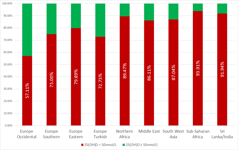 The statistical analysis demonstrated that subjects of European descent (including western + eastern + southern Europe and Turkey) and those from North Africa, the Middle East and Asia, i.e., people with lighter skin, are significantly less likely to show a vitamin D deficiency compared to Africans or Sri Lankans/Indians (p <0.0001), i.e., people with darker skin living in Switzerland. The results for the various ethnic groups are summarised in figures 2 and 3 .