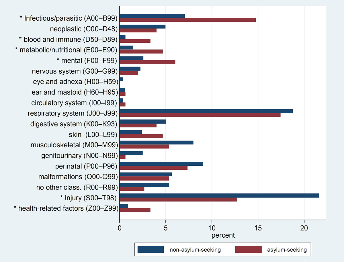 Figure 3 Proportion of main admission diagnosis according to the international disease classification (ICD) 10 for the non-asylum-seeking children (blue bars) and the asylum-seeking children (red bars).