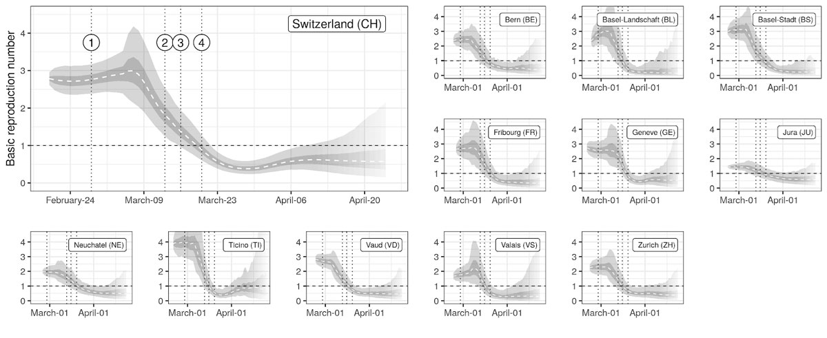 Figure 2 Estimates of changes in the basic reproduction number R0 Median (dashed line), IQR (dark gray) and the 95% QR (light gray) of the estimated time series of R0 are shown for each canton. Vertical dotted lines indicate the issuing of NPIs as described in figure 1. Transparency at the end of the time series indicates increasing uncertainty (style inspired by CMMID [13]).