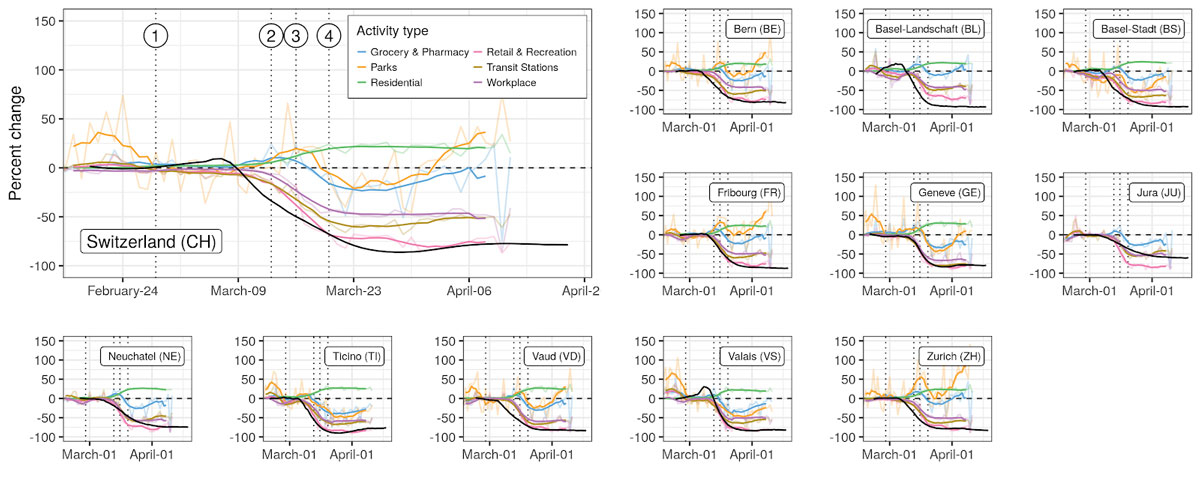 Activity-related mobility patterns changed markedly in all cantons since the beginning of the epidemic (fig. 3). Mobility related to work, retail and recreation, and transit stations dropped by 50% to 75% at the national level, with cantonal-level reductions ranging from 30% to 80% depending on activities. Residential-related mobility increased across cantons between 20% and 30%. We found strong support for mobility changes starting simultaneously for all activity types within each canton. We estimated that changes in mobility started between 6 and 14 March for all cantons (supplementary fig. 12), thus finding strong support for changes starting before school closure on 13 March (national-level mean probability across activities 0.70, cantonal range 0.55–0.99).