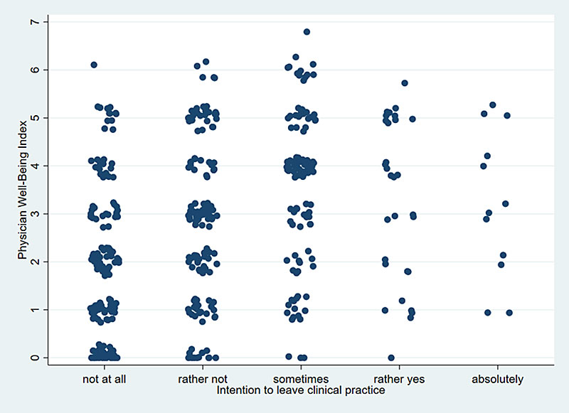 We found statistically significant, albeit weak to moderate, correlations between the PWBI and overall job satisfaction (rs [Spearman’s rho] = −0.54, p <0.001), medical errors (rs = 0.18, p <0.001), suicidal ideation (rs = 0.12, p = 0.009) and intention to leave clinical practice (rs = 0.38, p <0.001). Scatterplots of the relationships between the PWBI and practice-related outcomes are shown in the appendix 1.