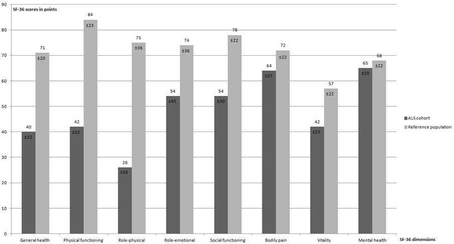 Time of first symptoms, diagnosis and treatment initiation were recorded. The diagnosis of definite, probable or possible ALS was established by an experienced neurologist according to the revised El Escorial criteria [30]. This neurologist also conducted neurophysiological investigations and, in case of diagnostic confirmation, prescribed riluzole. Patients were classified as “bulbar” or “non-bulbar” according to initial clinical presentation. The revised ALS Functional Rating Scale (ALS-FRS-R) was used to determine the progression of disability [31]. Mood disturbances and HRQL were assessed using the Hospital Anxiety and Depression Scale (HADS) [32, 33] and the Medical Outcomes Study Short Form-36 (SF-36) [34, 35].