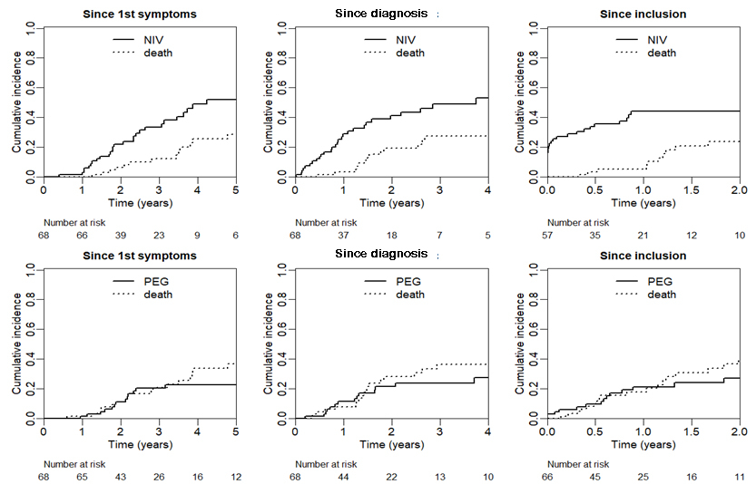 Study data were collected in SecuTrial®, a GCP-compliant electronic data capture system. Statistical analyses were essentially descriptive. Patient characteristics were described as frequencies and percentages for qualitative data and as means (SD) or medians (Q1–Q3) for quantitative data, according to the distribution of the data. Overall survival was estimated according to the Kaplan-Meier method. Cumulative incidences of noninvasive ventilation implementation and percutaneous gastrostomy were estimated using a competing risks analysis. This method allows computation of the cumulative incidence of an event of interest (e.g., implementation of NIV) in the presence of competing risks such as death [40]. All analyses were performed using R software, version 3.5.3 (R Foundation for Statistical Computing, Vienna, Austria; https://www-R-project.org).