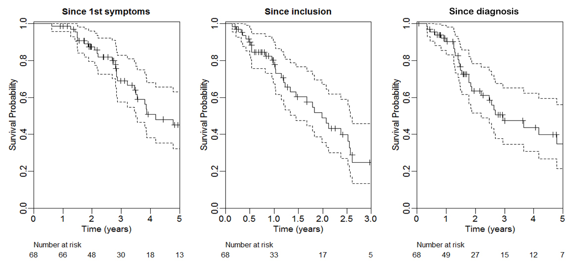 Survival: Median survival time was 50 (34–95) months from the first symptoms, 35 (18–70) months from diagnosis and 24 (12–31) months from inclusion in the cohort (fig. 3). Detailed survival probabilities are provided in table 3.