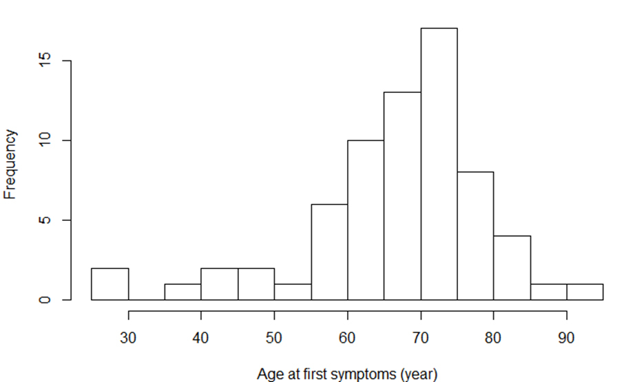 Figure 1 Age distribution at time of first symptoms (years); n = 68 subjects. Median (Q1–Q3): 69.1 (60.8–72.9)