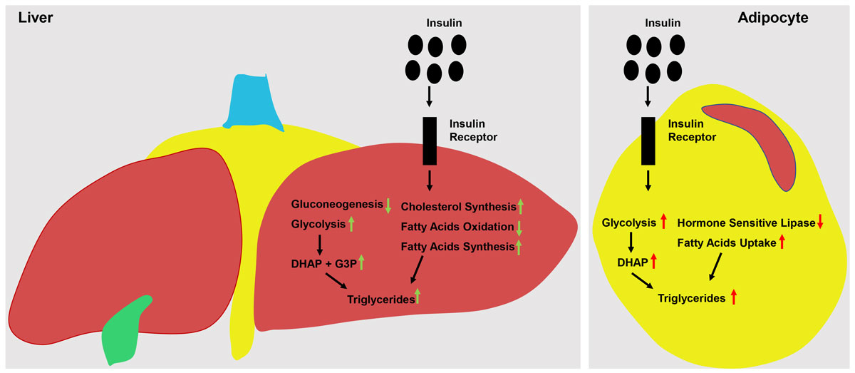Insulin also effects lipid metabolism. In the healthy state, insulin-induced activation of its receptor on hepatocytes boosts lipogenesis via increased expression of the transcription factor sterol regulatory element-binding transcription factor-1c (SREBP-1c) [31]. Indeed, SREBP-1c promotes the expression of genes involved in fatty acid synthesis and TG production [32]. Insulin action in hepatocytes also reduces the oxidation of fatty acids, hence increasing their availability for TG synthesis (fig. 1) [14]. In adipocytes, insulin reduces the action of hormone-sensitive lipase, an intracellular enzyme that is also activated by, for example, norepinephrine, and that induces the breakdown of TG into fatty acids and glycerol [33]. Also, in fat depots insulin is known to activate lipoprotein lipase, which facilitates lipid and fatty acids uptake (from circulating chylomicrons and lipoproteins) into adipocytes [34]. Thus, via (i) inhibition of hormone-sensitive lipase, (ii) activation of lipoprotein lipase, and (iii) enhanced glycolysis and hence production of dihydroxyacetone phosphate, insulin strongly stimulates the accumulation of TG in adipocytes (fig. 1) [10, 13, 19, 26, 27].