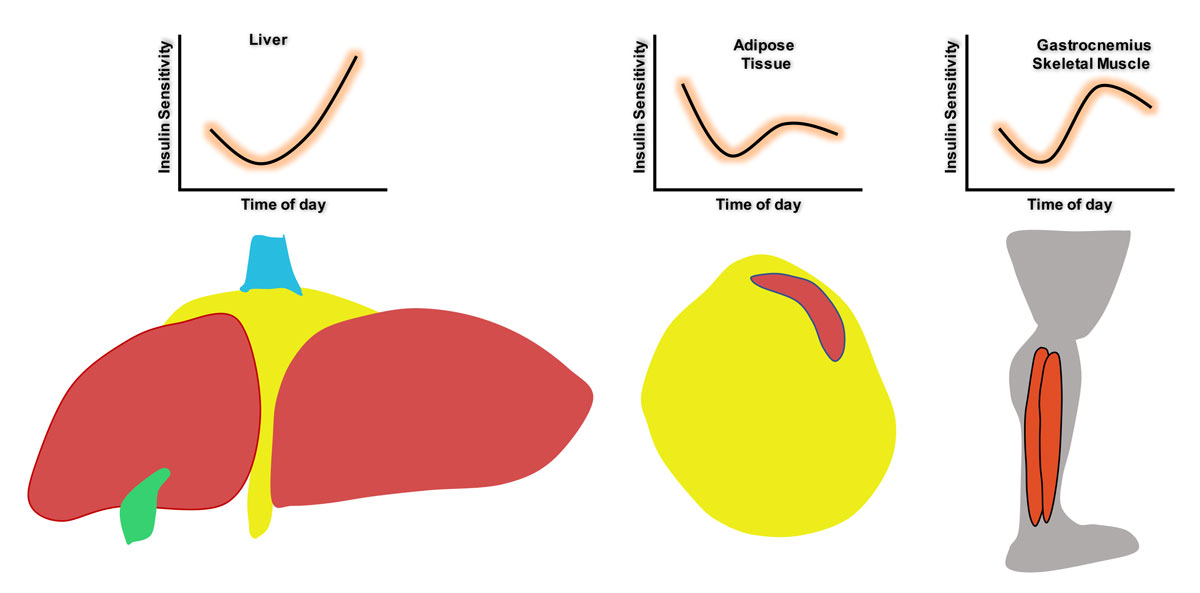 Figure 2 Tissue insulin sensitivity varies around the clock in vivo . Illustrations representing diurnal fluctuations in the insulin sensitivity of liver, adipose tissue and gastrocnemius skeletal muscle, as indicated by Aras et al. [139]. Drawings by Vincenzo Antonio Vianna Coppari.