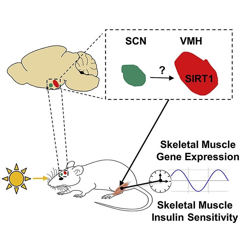 The first study to provide direct experimental evidence supporting the notion that insulin sensitivity varies around the clock was conducted by Aras et al. They provided data indicating that the insulin sensitivity of several metabolically relevant tissues (gastrocnemius and soleus skeletal muscle, liver and perigonadal white adipose tissue; pWAT) fluctuates substantially over a 24-hour period in vivo in mice (fig. 2) [139]. Moreover, by performing challenging gain- and loss-of-light-action experiments in mice with the NAD+-dependent deacetylase SIRT1 [140] either intact or lacking only in steroidogenic factor 1 (SF1) neurons of the ventromedial hypothalamic nucleus, they unveiled key elements of the neuronal mechanism underlying this important phenomenon. These key elements are (i) photic inputs, (ii) SIRT1 in SF1 neurons, and (iii) insulin action in gastrocnemius skeletal muscle [139]. Aras et al. revealed that SIRT1 in SF1 neurons conveys photic inputs to entrain the action of insulin at this peripheral site. This light-driven effect on insulin-induced glucose uptake in skeletal muscle via SIRT1 in ventromedial hypothalamic nucleus SF1 neurons represents a previously unrecognised neuronal mechanism which enables changes in light inputs to govern circadian insulin sensitivity in skeletal muscle [139] (fig. 3). Notably, this mechanism is of pathophysiological relevance as it is required for normal insulin and glucose homeostasis in vivo [139, 141]. This finding of Aras et al. agrees well with, and provides a potential neuronal and molecular explanation for, recent studies showing that altered core clock gene expression (in either a whole-body or in a tissue-specific manner) and exposure to photic inputs at the wrong time cause insulin resistance and negatively affect glucose metabolism [142–147].