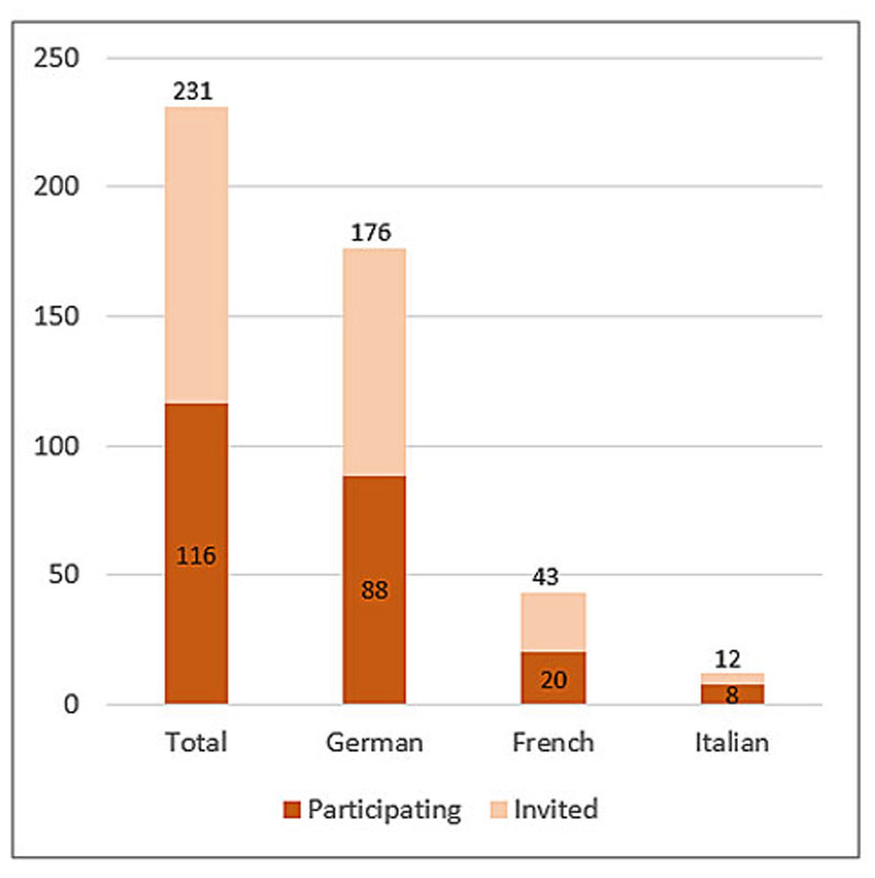 For this cross-sectional, multi-centre survey study, acute care and university hospitals, psychiatric hospitals, as well as the rehabilitation and speciality clinics named on the Swiss Hospitals Association (H+) hospital list [27] were eligible. It included 231 hospitals across Switzerland (German-speaking region: 176; French-speaking region: 43; Italian-speaking region: 12). Of that number, 74 (32%) belonged to hospital groups.